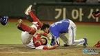 22일 광주구장에서 벌어진 기아 타이거즈와 삼성 라이온즈의 경기 삼성의 2회초 1사 2,3루서 박석민의 중견수 플라이 때 태그업한 3루 주자 진갑용이 기아 포수 송산과 홈에서 부딪친 뒤 함께 나동그라져 있다. 진갑용은 세이프