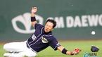22일 SK 와이번스와 두산 베어스의 인천 경기 SK의 3회말 1사 후 김민재의 타구를 전력질구한 두산 우익수 김창희가 아깝게 못잡고 있다. 2루수 안경현이 공을 재빨리 잡아 송구했지만 그 사이 김민재는 2루까지 진입했다./인천=주