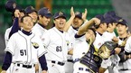 28일 기아 타이거즈와의 잠실 경기서 7-2로 이겨 이날 LG에 덜미를 잡힌 SK를 3위로 끌어내리며 2위로 올라서 플레이오프에 직행한 두산 베어스 선수들이 싱글벙글한 얼굴로 관중석에 인사하며 그라운드를 나서고 있다. 포수 홍성