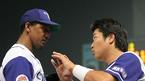 28일 문학구장에서 벌어진 SK 와이번스와 LG 트윈스의 시즌 최종전서 SK 선발투수 크루즈가 1회 홈런 포함 2안타를 내준 뒤 공수 교대하면서 박재홍이 제구가 높게 된다며 낮게 던지라고 조언하고 있다./인천=손용호 기자 spjj@osen.co