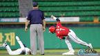 28일 두산 베어스와 기아 타이거즈의 잠실 경기 두산의 5회말 1사 만루서 나주환의 우익수 플라이 때 태그업한 3루 주자 홍성흔이 전력질주, 홈에 슬라이딩으로 들어오고 있다. 송구가 약간 늦은 데다 옆으로 흘러 세이프됐다. /