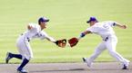 2일 문학구장에서 벌어진 SK 와이번스와 한화 이글스의 준PO 2차전 한화의 4회초 1사 1루서 브리또의 2루 베이스를 통과한 깊은 타구를 유격수 김민재(왼쪽)와 2루수 정경배가 함께 쫓아가고 있다. 공은 정경배의 글러브로 들어갔