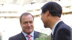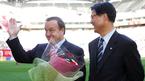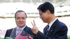 2일 서울 상암 월드컵경기장에서 벌어진 FC 서울과 인천 유나이티드의 경기를 관전하러 나왔다가 그라운드에 내려온 아드보카트 신임 국가대표팀 감독에게 한웅수 FC 서울 단장이 꽃다발을 전달한 뒤 손으로 'V자' 사인을 해달라