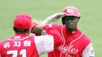 3일 문학구장에서 벌어진 SK 와이번스와 한화 이글스의 준PO 3차전. 한화 5회초 공격 1사 1루에서 데이비스가 우중간 담장을 넘어가는 역전 투런 홈런을 치고 유지훤 3루 주루코치와 익살스럽게 경례를 주고 받고 있다. /인천=손용