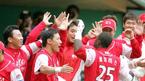 3일 문학구장에서 벌어진 SK 와이번스와 한화 이글스의 준PO 3차전은 한화가 SK에 5-3으로 역전승을 거두었다. 9회말 1사 1, 2루에서 박경완의 병살타로 경기를 매조지한 거둔 한화 선수들이 그라운드를 빠져 나오며 좋아하고 있다.