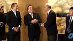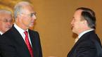 4일 저녁 서울 하얏트 호텔에서 열린 만찬에 앞서 프란츠 베켄바워 독일월드컵 조직위원장과 신임 대표팀 아드보카트 감독이 인사를 나누고 있다. 베켄바워는 2006 독일 월드컵 홍보차 본선 진출국들을 순회 방문하고 있다. /하