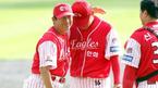 9일 잠실구장에서 벌어진 두산 베어스와 한화 이글스의 PO 2차전 두산의 4회말 2사 2,3루서 장원진의 우전안타 때 홈을 밟은 전상렬을 홍성흔(왼쪽)이 반갑게 맞이하고 있다. 전상렬은 앞서 2사 만루에서 2타점 선제 적시타를 친