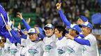 19일 잠실 구장에서 벌어진 한국시리즈 4차전서 삼성이 두산에 10-1로 대승, 4전 전승으로 우승을 차지했다. 미리 준비해 둔 우승 기념 티셔츠와 모자를 쓴 삼성 선수들이 어깨동무를 하고 펄쩍펄쩍 뛰며 우승을 즐기고 있다./잠실