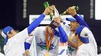 19일 잠실 구장에서 벌어진 한국시리즈 4차전서 삼성이 두산에 10-1로 대승, 4전 전승으로 우승을 차지했다. 시상식서 삼성의 김재걸이 '한국야구 100주년 돔구장 만들자'라고 쓴 셔츠를 보이며 깜짝 쇼를 펼치고 있다./잠실=주지