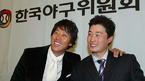 31일 서울 소공동 프라자 호텔에서 2005 삼성파브 프로야구 최우수선수 및 신인왕 투표 및 각 부문별 시상식이 열렸다. 최우수선수 후보인 이병규(왼쪽)와 오승환이 어깨동무를 하고 기념사진을 찍고 있다./손용호 기자 spjj@osen.co