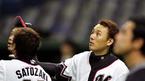 오는 10일 코나미컵 아시아시리즈 2005 대회 첫날 삼성 라이온스와 대결한 롯데 마린스의 이승엽이 8일 오후 경기가 열릴 도쿄돔에서 가진 훈련 도중 김성근 코디네이터와 함께 웃고 있다./도쿄돔=손용호 기자spjj@osen.co.kr [Copyright