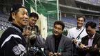 오는 10일 코나미컵 아시아시리즈 2005 대회 첫날 삼성 라이온스와 대결할 롯데 마린스의 이승엽이 8일 오후 경기가 열릴 도쿄돔에서 훈련을 가진 뒤 권오택 삼성 홍보부장(왼쪽)과 오랫만에 만나 반가워하고 있다. /도쿄돔=손용