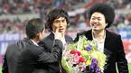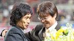 12일 저녁 서울 상암 월드컵경기장에서 벌어진 한국-스웨덴 친선경기 하프타임에 열린 김태영의 국가대표 은퇴식에서 선배이자 소속팀 전남 드래곤즈 코치인 황선홍이 꽃다발을 전달하며 포옹하고 있다./상암=주지영 기자 jj0jj0