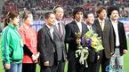 12일 저녁 서울 상암 월드컵경기장에서 벌어진 한국-스웨덴 친선경기 하프타임에 김태영의 국가대표 은퇴식이 열렸다. 김태영이 국내외 팬, 정몽준 대한축구협회장, 황선홍 코치, 개그맨 윤택 등과 함께 기념사진을 찍고 있다./