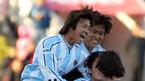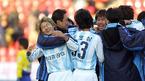 성남종합운동장에서 20일 열린 성남 일화와 울산 현대의 플레이오프서 울산 현대가 2-1 승리로 결승에 진출하게 되자 이천수가 동료 선수들과 기뻐하고 있다. 뒤에는 성남일화 선수가 고개를 숙인채 아쉬워 하고 있다./성남=주지