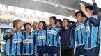 4일 울산 문수 월드컵경기장에서 벌어진 2005 삼성 하우젠리그 챔피언 결정전 2차전을 끝으로 시즌 우승을 차지한 울산 선수들이 시상식서 우승컵을 앞에 놓고 환호하고 있다./울산=손용호 기자 spjj@ [Copyright ⓒ OSEN(www.osen.co.kr) 무
