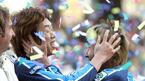 4일 울산 문수 월드컵경기장에서 벌어진 2005 삼성 하우젠리그 챔피언 결정전 2차전을 끝으로 시즌 우승을 차지한 울산의 현영민과 이천수(오른쪽)가 서로의 얼굴을 쓰다듬으며 기쁨을 나누고 있다. /울산=손용호 기자 spjj@ [Copyri