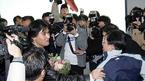 지난달 30일 하와이서 결혼식을 올린 샌디에이고 파드리스의 박찬호가 6일 저녁 아시아나 항공편을 이용, 인천공항을 통해 혼자 귀국했다. 박찬호가 팬클럽으로부터 꽃다발을 받으며 반가워 하고 있다./인천공항=손용호 기자 spj