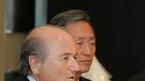 일본을 거쳐 13일 오전 인천공항을 통해 내한한 제프 블래터 국제축구연맹회장이 이날 오후 서울 하얏트 호텔에서 기자회견을 가졌다. 블래터 회장이 하야투 부회장과 정몽준 부회장에게 자리에 앉으라고 얘기를 하고 있다./손