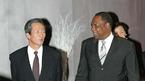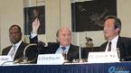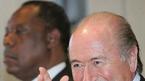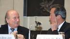 일본을 거쳐 13일 오전 인천공항을 통해 내한한 제프 블래터 국제축구연맹회장이 이날 오후 서울 하얏트 호텔에서 기자회견을 가졌다. 정몽준 FIFA 아시아 대표 부회장이 하야투 FIFA 아프리카 대표 부회장과 얘기를 나누며 기자