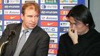 18일 유럽으로 떠나는 딕 아드보카트 국가대표팀 감독이 코칭스태프와 함께 17일 서울 상암 월드컵경기장에서 송년 기자회견을 가졌다. 회견 중 아드보카트 감독과 베어벡 수석코치가 심각한 표정으로 얘기를 나누고 있다./손