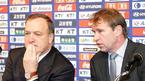 18일 유럽으로 떠나는 딕 아드보카트 국가대표팀 감독이 코칭스태프와 함께 17일 서울 상암 월드컵경기장에서 송년 기자회견을 가졌다. 아드보카트 감독이 질문에 답하는 사이 베어벡 수석코치가 홍명보 코치와 상의하고 있다.