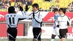 홍명보 장학재단이 주최하는 2005 푸마 자선축구 경기가 전 국가대표 중심의 사랑팀(흰색 상의)과 현 대표 위주의 희망팀(푸른색 상의)으로 나뉘어 18일 오후 수원 월드컵경기장에서 열렸다. 사랑팀의 정조국(가운데)이 선제골