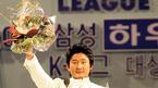 2005 삼성 하우젠 K리그 대상 시상식이 28일 오후 서울 홍은동 그랜드 힐튼호델 컨벤션룸에서 열렸다. 미드필더 베스트 11에 뽑힌 김두현이 인기 가수 아이비로부터 꽃다발을 건네받고 있다./손용호 기자 spjj@osen.co.lkr [Copyright ⓒ