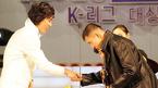 2005 삼성 하우젠 K리그 대상 시상식이 28일 오후 서울 홍은동 그랜드 힐튼호델 컨벤션룸에서 열렸다. 올 시즌을 끝으로 은퇴한 김태영(오른쪽)이 MVP로 선정된 이천수를 축하해 주고 있다./손용호 기자 spjj@osen.co.lkr [Copyright ⓒ 한