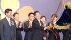 삼화저축은행(회장 신삼길)이 남자 프로골프 유망주들을 대거 영입, 10일 서울 논현동 임페리얼 팰리스호텔에서 골프단 창단식을 가졌다. 신삼길 구단주로부터 전해 받은 단기를 박재영 단장이 흔들고 있다./주지영 기자 jj0jj0@os