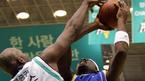 11일 원주 치악실내체육관에서 벌어진 2005~2006 KCC 프로농구 원주 동부 프로미와 서울 삼성 썬더스의 경기 동부의 데이비스가 골밑을 돌파하다 삼성 존슨에 막히자 뒤에 있는 선수에게 노 룩 패스를 하고 있다./원주=주지영 기자 j