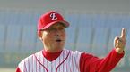 모자의 로고를 바꾼 한화 이글스가 19일 대전 한밭운동장에서 포토데이 행사를 가졌다. 김인식 감독이 구장 벽에 걸린 격려 문구 중 '승리!' 라는 글자 아래서 환하게 웃고 있다./대전=박영태 기자 ds3fan@osen.co.kr [Copyright ⓒ 한국