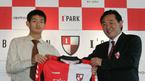 북한대표 출신 안영학이 22일 오전 서울 대치동 파크 하얏트호텔에서 부산 아이파크 입단식을 가졌다. 안영학이 입단 계약서에 사인한 뒤 이준하 부산 아이파크 사장과 함께 유니폼을 들어보이고 있다./박영태 기자 ds3fan@osen.co.k
