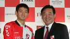 일본 도쿄 베르디서 활약하던 청소년대표 출신 수비수 이강진이 부산 아이파크에 전격 입단, 23일 오전 서울 대치동 파크 하얏트호텔에서 입단식을 가졌다. 이강진이 이준하 부산 아이파크 사장과 함께 유니폼을 들어보이고 있
