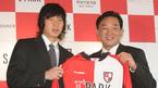 북한대표 출신 안영학이 22일 오전 서울 대치동 파크 하얏트호텔에서 부산 아이파크 입단식을 가졌다. 안영학이 입단 계약서에 사인한 뒤 부산 유니폼을 입고 이준하 부산 아이파크 사장과 악수를 하며 환하게 웃고있다./박영