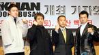 오는 2월 25일 부산 벡스코에서 벌어지는 K-1 FIGHTING NETWORK KHAN 2006 대회 개최 기자회견이 26일 오후 서울 신라호텔에서 열렸다. 최재식(왼쪽)과 임치빈(오른쪽)이 대회를 주관한 양명규 TMG 대표(오른쪽에서 두 번째)와 함께 대회의