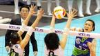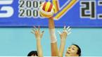 2일 서울 올림픽공원 펜신경기장에서 벌어진 KT&G 2005-2006 V-리그 여자부 현대건설 그린폭스와 KT&G 아리엘즈와 경기서 현대건설의 정대영이 KT&G 최희정의 단독 블로킹 앞에서 타점 높은 강스파이크를 때리고 있다./올림픽공원=주