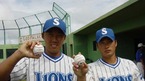 야구월드컵(WBC)에 출전할 삼성 라이온즈의 간판 투수 배영수(왼쪽)와 오승환이 괌 전지 훈련지에서 연습하면서 감각을 익히고 있는 대회 공인구를 들어보이고 있다./삼성 라이온즈 제공 [Copyright ⓒ 한국 최고의 스포츠 전문 미