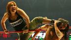 경기도 광명 경륜돔에서 10일 열린 IMPACT 2006 월드 레슬링 챔피언십 여자 태그팀 매치에서 미즈 제넷과 짝을 이룬 마유미 오자키가 한국계 여성 레슬러 게일 김의 짝인 조세라인의 얼굴을 발로 밀고 있다. /광명 경륜돔=주지영 기