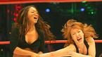 경기도 광명 경륜돔에서 10일 열린 IMPACT 2006 월드 레슬링 챔피언쉽 여자 태그팀 매치에서 조세라인과 짝을 이룬 한국계 여성 레슬러 게일 김이 미즈 제넷과 짝을 이룬 마유미 오자키를 발로 차고 있다. /광명 경륜돔=주지영 기자