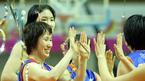 21일 안산 와동체육관에서 벌어진 2006 금호아시아나배 여자 프로농구 겨울리그 최종일 신한은행-우리은행전서 70-66으로 이겨 정규리그 우승을 차지한 우리은행의 주부 선수 김영옥이 후배들과 하이파이브를 나누고 있다./안산=