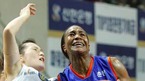 21일 안산 와동체육관에서 벌어진 2006 금호아시아나배 여자 프로농구 겨울리그 최종일 신한은행-우리은행 전서 우리은행의 타미카 캐칭이 볼을 놓치며 넘어지는 순간 신한은행의 선수진과 타즈 맥윌리암스가 두 팔을 올리며