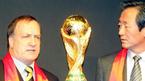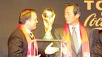 28일 오전 서울 하얏트 호텔에서 FIFA 월드컵 트로피 진품이 국내 최초로 공개돼 찬란한 황금빛을 발하고 있다. 코카콜라가 주관한 월드컵 트로피 투어의 일환으로 한국을 찾은 진품 주변에서 딕 아드보카트 감독,정몽준 대한축