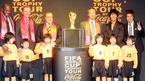 28일 오전 서울 하얏트 호텔에서 FIFA 월드컵 트로피 진품이 국내 최초로 공개돼 찬란한 황금빛을 발하고 있다. 코카콜라가 주관한 월드컵 트로피 투어의 일환으로 한국서 열린 이날 행사에 TV 프로그램에 등장하는 FC 슛돌이 축구