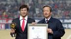 1일 서울 상암 월드컵경기장에서 벌어진 앙골라전 하프타임에 올 시즌부터 성남 일화의 코치가 된 김도훈의 국가대표 은퇴식이 열렸다. 김도훈 코치가 정몽준 대한축구협회장과 함께 기념촬영하고 있다./상암=박영태 기자 ds3fan