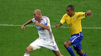 프랑스가 2일(한국시간) 새벽 프랑크푸르트에서 벌어진 2006 독일 월드컵 8강전서 강력한 우승후보인 브라질에 티에리 앙리의 한 방으로 1-0으로 승리하는 파란을 일으켰다. 후반전 종료 시간이 다 된 상황서 서 브라질의 호나우두(7번) 등이 경기를 포기한 듯 비에라의 드리블에 적극적으로 대응하지 않고 있다./ 프랑크푸르트=송석린...