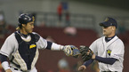 6일 잠실 구장에서 열린 두산 베어스와 KIA 타이거즈 경기에서 두산 포수 홍성흔과 선발 랜들이 4회말 수비를 마치고 들어오면서 하이파이브를 하고 있다. 랜들은 이날 6회부터 폭우가 쏟아지는 바람에 5이닝만 던지고 승리투수가 되는 행운을 누렸다./잠실=김영민기자ajyoung@osen.co.kr [Copyright ⓒ 한국 최고의 스포츠 엔터테인먼트...