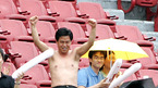 9일 잠실 야구장에서 벌어진 LG 트윈스와 롯데 자이언츠의 경기 태풍의 영향으로 간간히 비가 오는 가운데 롯데 투수 손민한이 LG 이병규를 삼진으로 처리하자 웃 옷을 벗은 롯데 팬이 두팔을 들고 좋아 하고 있다./잠실=손용호 기자spjj@osen.co.kr [Copyright ⓒ 한국 최고의 스포츠 엔터테인먼트 전문 미디어...