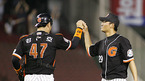 9일 잠실 야구장에서 벌어진 LG 트윈스와 롯데 자이언츠의 경기는 롯데 손민한의 9이닝 1실점 역투로 LG에 연장 10회 2-1로 승리했다. 롯데의 마무리 나승현이 LG의 10회말 LG 공격을 삼자 범퇴 세이브를 거둔후 강민호 포수와 하이파이브를 하고 있다./잠실=손용호 기자spjj@osen.co.kr [Copyright ⓒ 한국 최고의 스포츠...