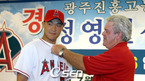 광주 진흥고 우완 투수 정영일이 9일 오후 광주 마스터스 호텔에서 미국 메이져리그 로스앤젤레스 에인절스 오브 애너하임 입단 조인식을 가졌다. 에인절스의 에디 베인 스카우트 팀장이 정영일에게 유니폼을 입혀주며 마지막 단추를 잠궈주고 있다./광주=박영태 기자 ds3fan@osen.co.kr [Copyright ⓒ 한국 최고의 스포츠 엔터테인먼트 전문...